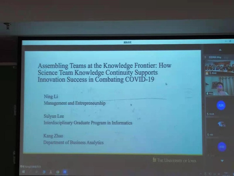 上午论坛正式开始后由永利集团88304官网人力资源管理学系副教授、思谋会创始人现任秘书长赵宜萱主持。论坛首先由美国爱荷华大学李宁教授作了题为“AssemblingTeams at the Knowledge Frontier: How Science Team Knowledge Continuity SupportsInnovation Success in Combating COVID-19(在知识前沿组建团队:科学团队的知识连续性如何支持创新成功对抗新冠肺炎病毒)”的线上主题报告。李宁教授基于知识的连续性与创新谈到新兴领域需要关注知识深度而成熟领域需要关注知识的广度。最后针对未来的发展,李宁教授认为数据科学和管理科学应各进一步,实现可解释的机器学习。