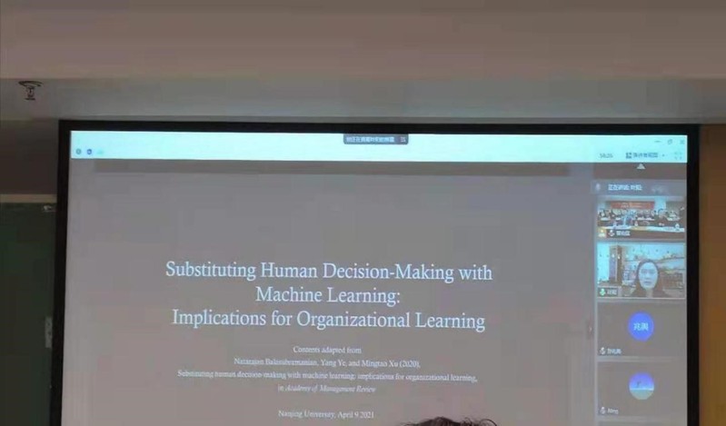 第二场由西南财经大学叶阳副教授作了题为“SubstitutingHuman Decision-Making with Machine Learning: Implications for OrganizationalLearning (用机器学习代替人类决策:对组织学习的启示)”的线上主题报告。叶阳副教授对比了人类学习与机器学习,分析了其中的机制,叶阳副教授介绍了当组织使用机器学习替代人类做决策时可能存在的潜在问题并提出机器学习在组织学习中的未来研究方向。