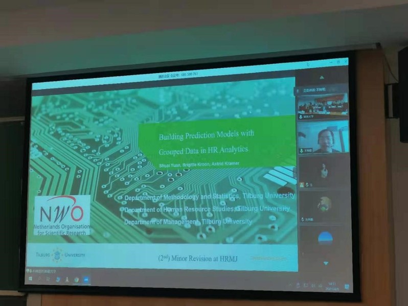其次,来自蒂尔堡大学博士研究生袁帅作了题为“(基于分组数据的)监督学习在人力资源分析中的应用”的线上报告,袁帅分享了用于处理多级数据集的不同策略并分析了需要考虑的重要因素。