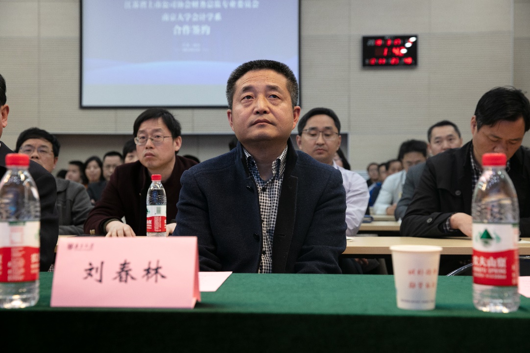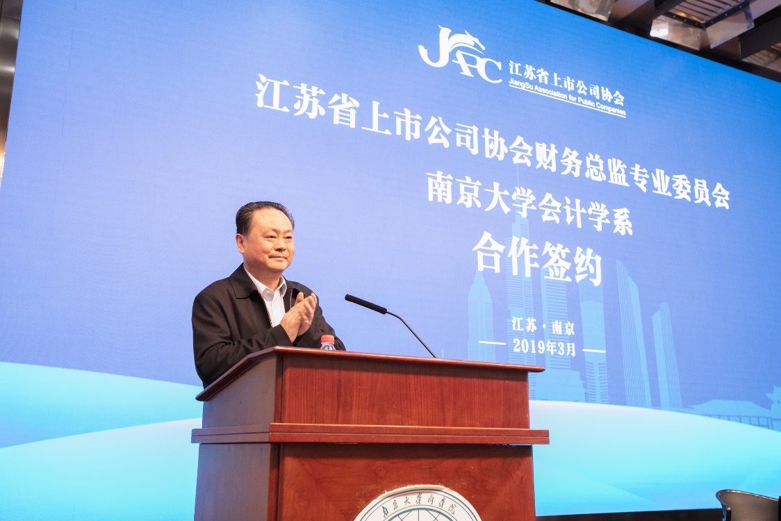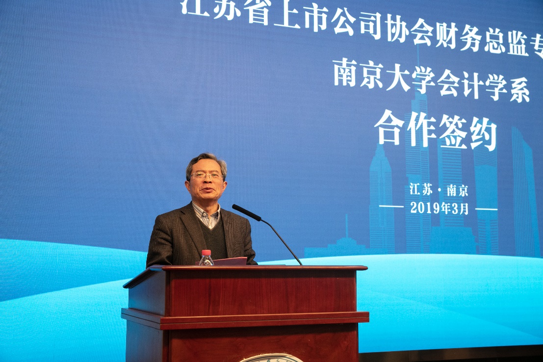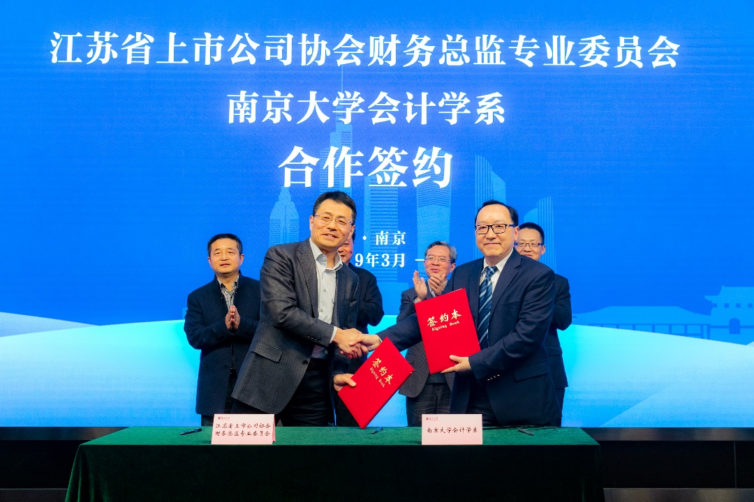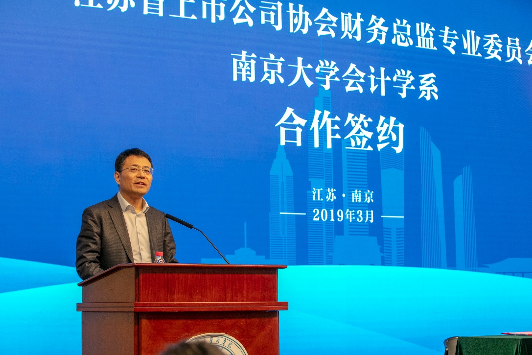 致辞结束后,江苏省上市公司协会财务总监委员会主任赵建国先生与永利集团88304官网管理学院会计学系主任陈冬华教授进行了战略合作协议签署仪式,杨忠副书记、胡昇荣董事长、省上市公司协会李齐兵秘书长、我校管理学院刘春林副院长,共同见证了签约仪式的举行。